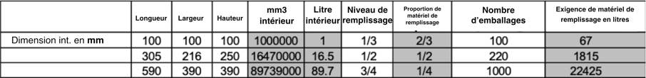 Une boîte de 100 x 100 x 100 mm a un volume de remplissage de 1 litre.